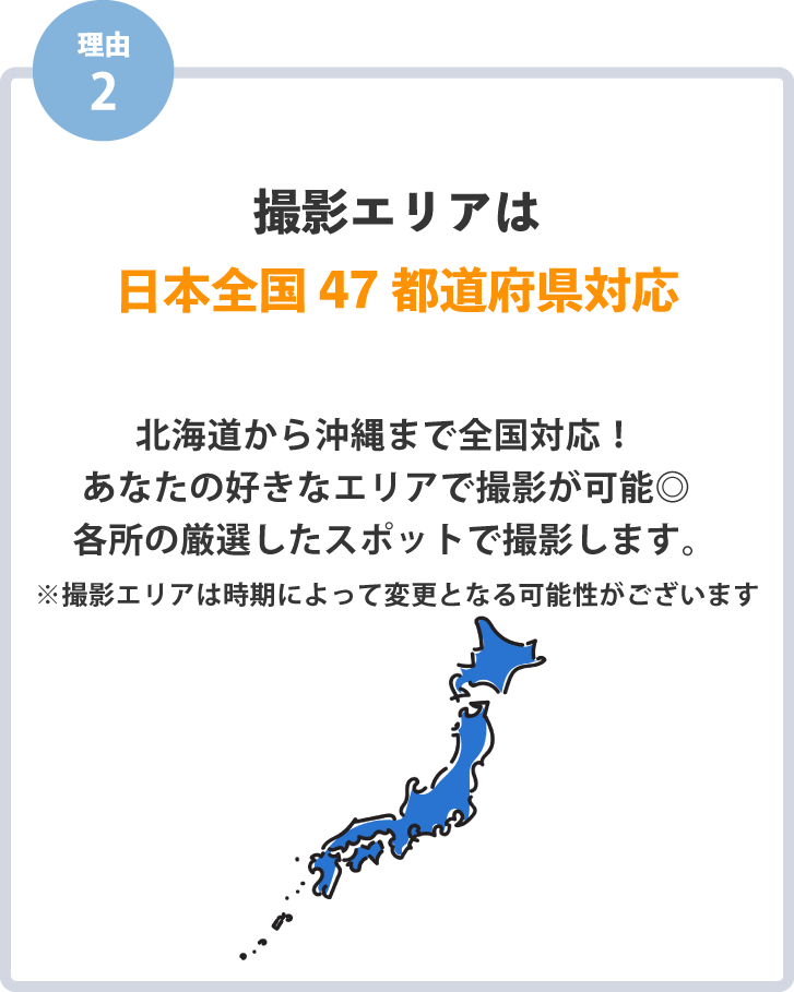 ※ただし雷雨、暴風雨など撮影できない状況や撮影スポットによっては中止の場合も御座います。